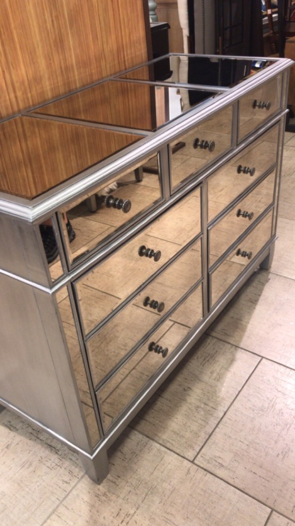 My love for this style started several years ago when I discovered the Hayworth Collection at Pier 1 Imports, smoky mirrored furniture pieces that pack a stark punch in my living room and master bedroom.