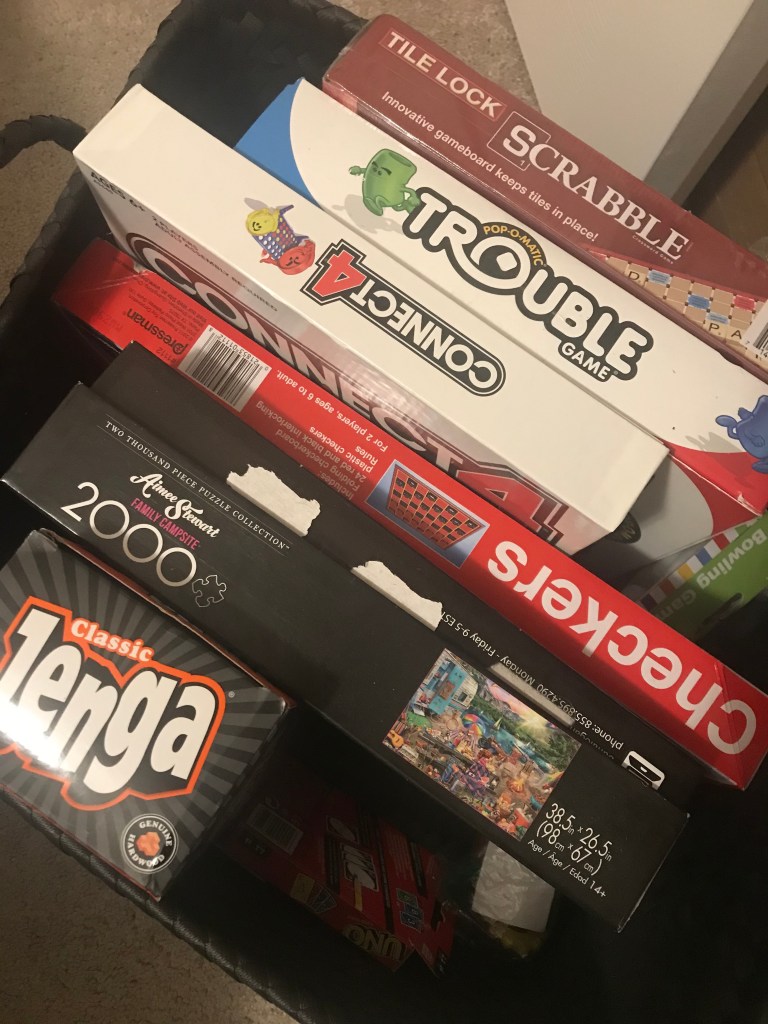 Games, puzzles, cards. Eat only when you’re hungry. Occupy your time with Jenga, Scrabble or Solitaire.