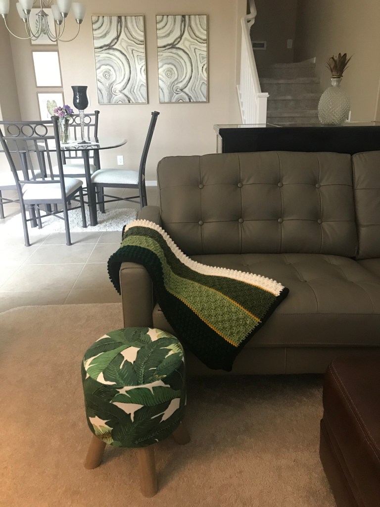 The fabric has a leaf motif that goes perfect with the C-table I bought at Pier 1 Imports. It adds color to the sea of grey and silver that’s running throughout the room. It’ll round out the nature look I’m going as I bring in more faux plants and succulents.